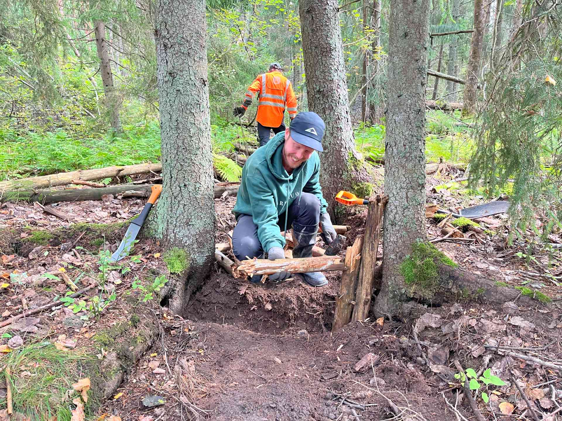 ”Ei ole olemassa mitään sabluunaa, miten ennallistetaan. Jokainen kohde on erilainen. Joskus maa on kovaa, joskus virtaukset erilaisia. Nyt kun toimitaan luonnonsuojelualueella, puut otetaan maasta eikä niitä kaadeta lähialueelta. Tässä tapauksessa hyödynsimme alueella ollutta lahopuuta. Padot myös maisemoidaan, ja nyt syksyllä siihen voi hyödyntää lehtikariketta.”, Puusti jatkaa.