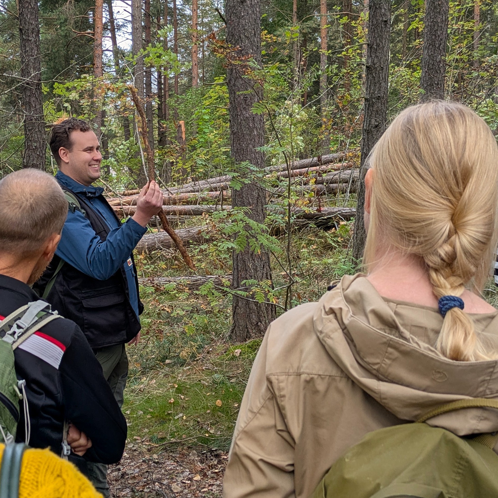 Skanssin harjun metsissä on paljon samanikäistä ja tiheää mäntypuustoa. Kierroksella tutustuttiin kahdella erilaisella tavalla tehtyyn pienaukkoon, joita vierailun jälkeen on tehty jo viisi. Yhdessä pienaukossa puut on kaadettu sekaisin eri suuntiin ja osa puista on sahattu epätasaisesti pyrkien jäljittelemään myrskytuhoa ja salamaniskua. Toisessa pienaukossa kaikki puut kaadettiin samaan suuntaan. Alueella jätetään kuitenkin suuret maisemapuut pystyyn, jotta alue pysyy maisemallisesti ja muutenkin monimuotoisena. Kaupunki on viestinyt ahkerasti hakkuutöistä taustoittaen niiden merkitystä monimuotoisuudelle. Pienaukot ja kaulaaminen monipuolistavat metsän rakennetta ja monimuotoistavat alueella elävää eliöstöä. Kaatuneet ja lahoavat puut luovat alueelle uusia pienelinympäristöjä, jossa viihtyvät eri eliöt kuin muualla metsässä. Turun yliopiston biodiversiteettiyksikön tutkimusavustaja Max Koistinen havainnollisti retkeläisille, miten yksi maahan pudonnut kuivunut oksakin voi olla monimuotoisuuden kannalta elintärkeä ympäristö. Tällaiset toimet ovat tärkeitä myös talousmetsissä luonnonhoidon menetelminä.