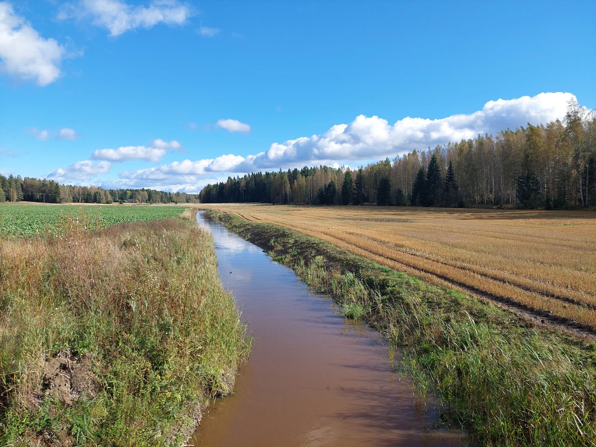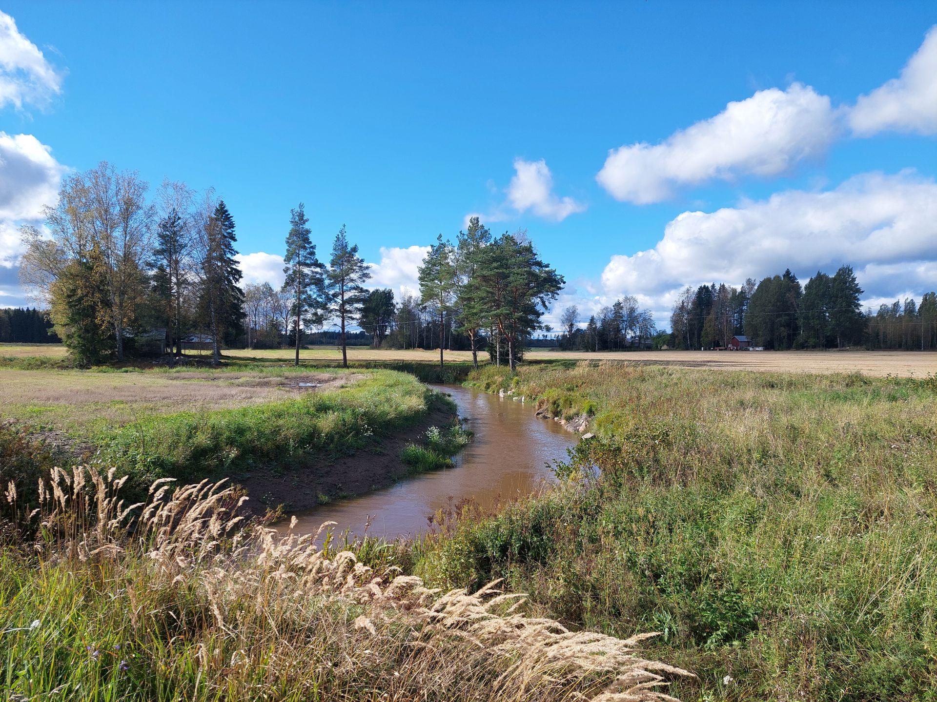 Hennijoen tulvatasanteet olivat täynnä vettä eikä pelloilla ollut tulvaa eli tulvatasanteet toimivat syyskuun lopulla. Kuva: Katariina Yli-Heikkilä