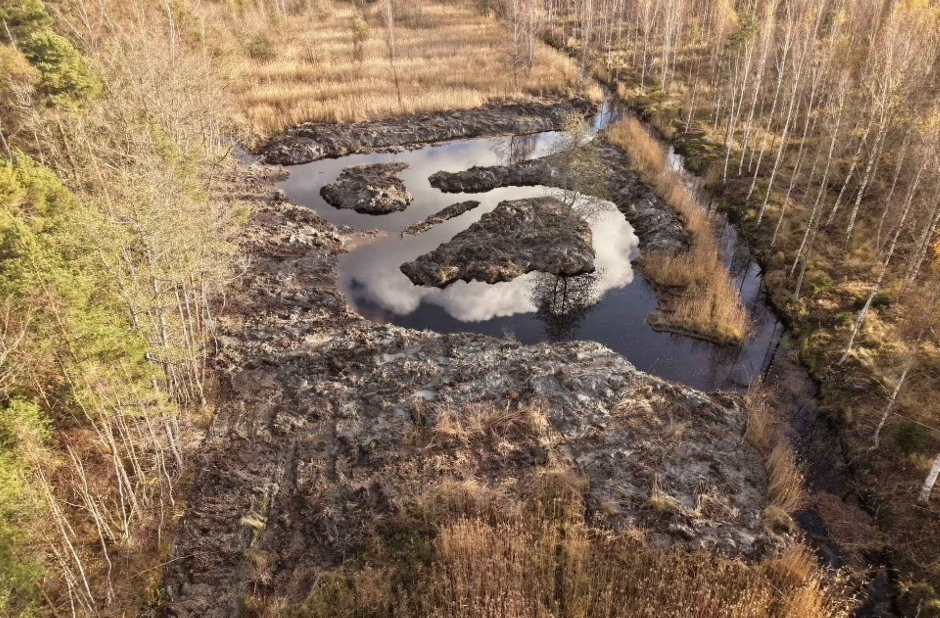 Lokakuussa valmistui ensimmäinen kosteikkoallas, joka on syvempi ja toimii enemmän ravinteiden kerääjänä. Toisen, tulevan altaan painotus on luontoarvoissa, ja siitä pyritään rakentamaan kalojen kutu- ja lintujen pesimäalue. Kuva: Jere Mäntsälä / Haavaisten vesiensuojeluyhdistys ry