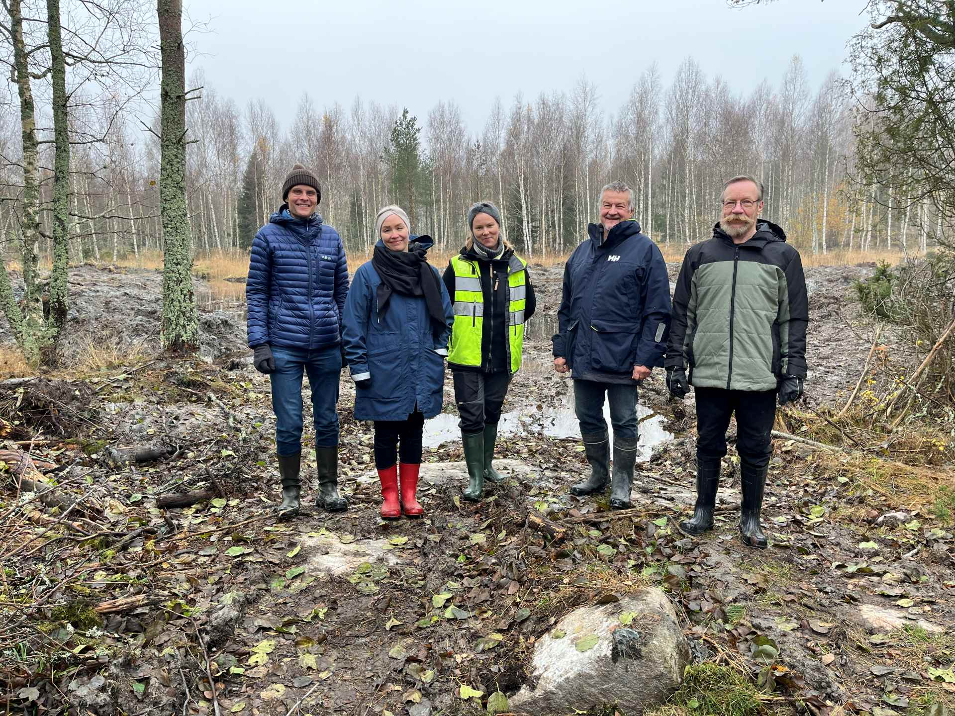 Lokakuussa Haavaisten vesiensuojeluyhdistys esitteli juuri valmistunutta ensimmäistä vaihetta kosteikosta Säästöpankille ja Valonialle. Kuvassa vasemmalla Säästöpankki Kalanti-Pyhärannan toimitusjohtaja Ossi Öhman, Valonian kehittämisasiantuntija Anni Lahtela ja projektiasiantuntija Sanna Kivimäki, sekä Haavaisten vesiensuojeluyhdistyksen puheenjohtaja Timo Tuina ja tiedottaja Heikki Mäntsälä. Kuva: Anni Himberg.