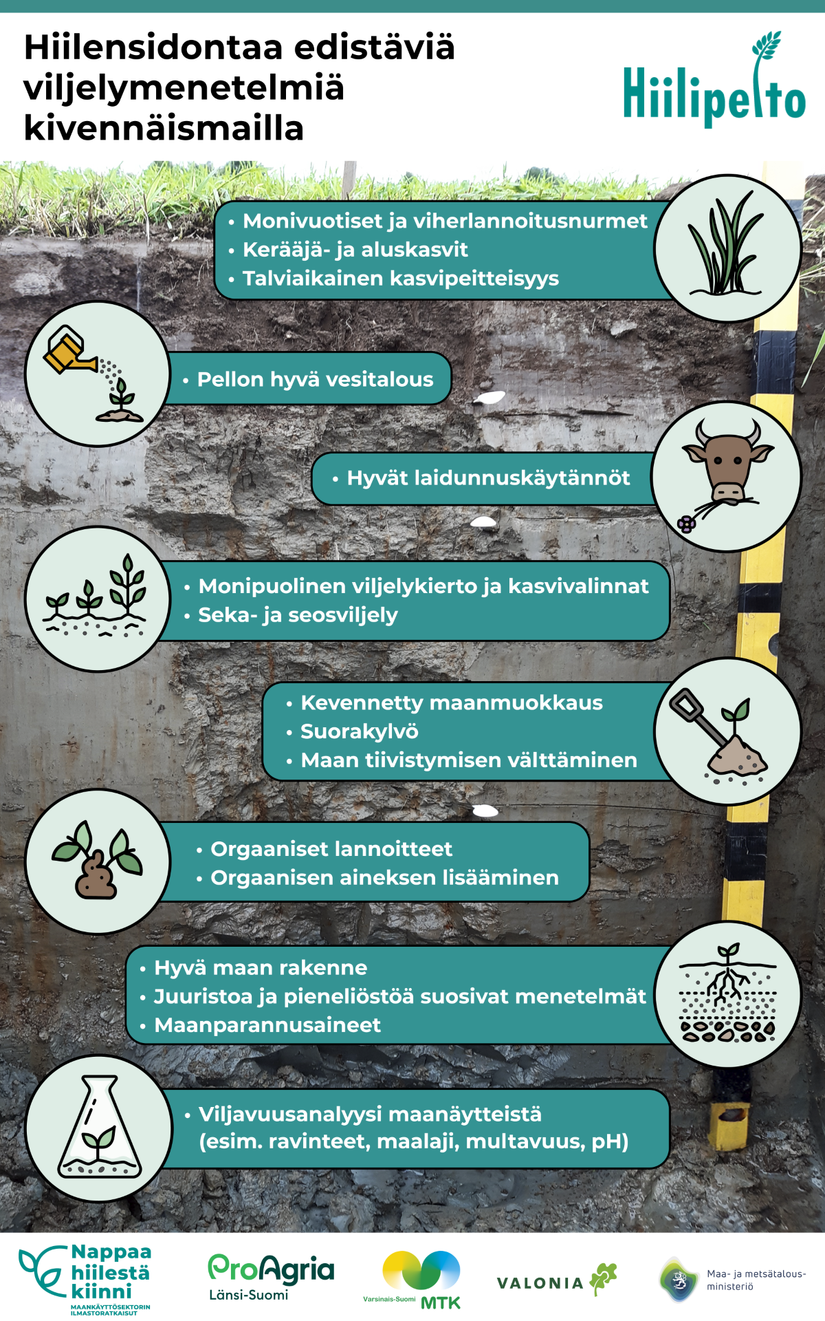 Oikeanlaisten viljelymenetelmien valinnalla voidaan huolehtia maan kasvukunnosta ja pellon vesitaloudesta. Toimien avulla saadaan lisättyä hiilensidontaa ja napattua talteen valumavesien ravinteet ja hiili. Orgaanisen aineksen lisäämisellä on positiivisia vaikutuksia myös pellon tuottavuuteen ja satoon. Varsinais-Suomessa suurin osa pelloista on kivennäismaita, ja erityisesti savimaita, joiden nykyisistä hiilivarastoista huolehtiminen ja hiilen kerryttäminen syvempiin kerroksiin on erityisen tärkeää. Suomen kivennäismaapeltojen hiilivarasto on pienentynyt viime vuosikymmenien aikana noin 0,4 % vuodessa (Luken seurannassa n. 100-200 kg/ha/vuosi).