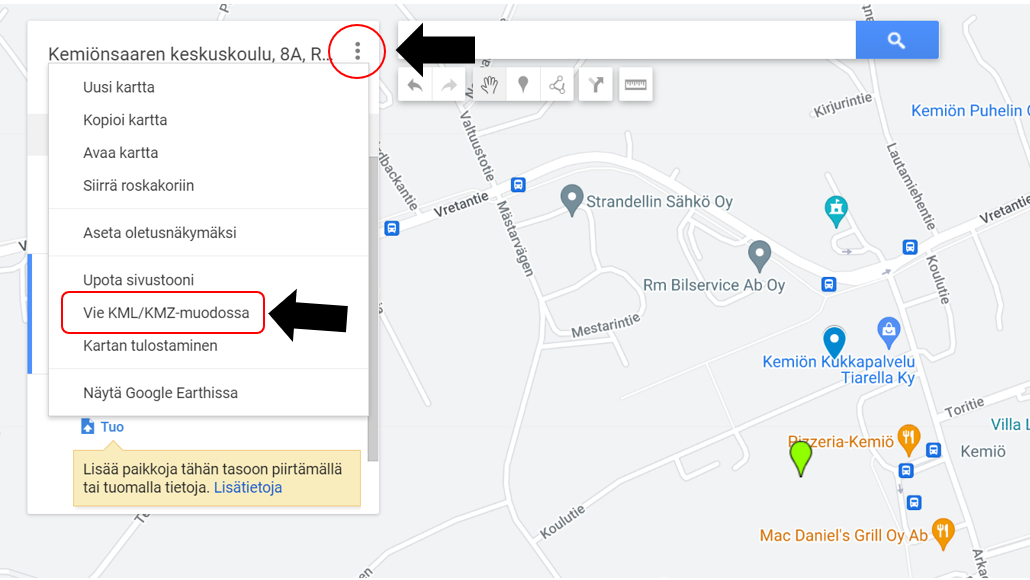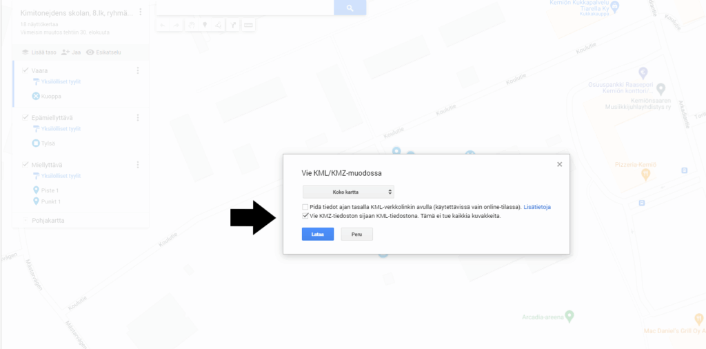 - ”Vie KMZ-tiedoston sijaan KML-tiedostona. Tämä ei tue kaikkia kuvakkeita.”