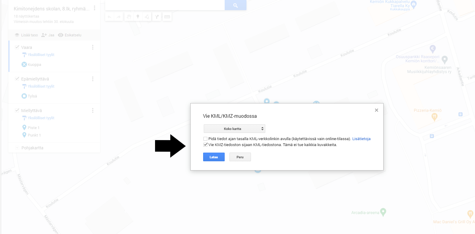 Kun tiedoston toimittaa kuntaan KML-tiedostona, saa kunta käyttöönsä kartan, jossa jokaisen pienryhmän vastaukset näkyvät omina tasoinaan, ja tietoja voi suodattaa esimerkiksi luokka-asteen tai oppilaitoksen mukaan. Opettajan ei tarvitse saada KML-tiedostotyyppiä auki omalla koneellaan, riittää että tiedoston lataa alla olevien ohjeiden mukaisesti ja lähettää eteenpäin.