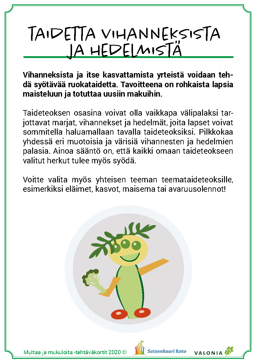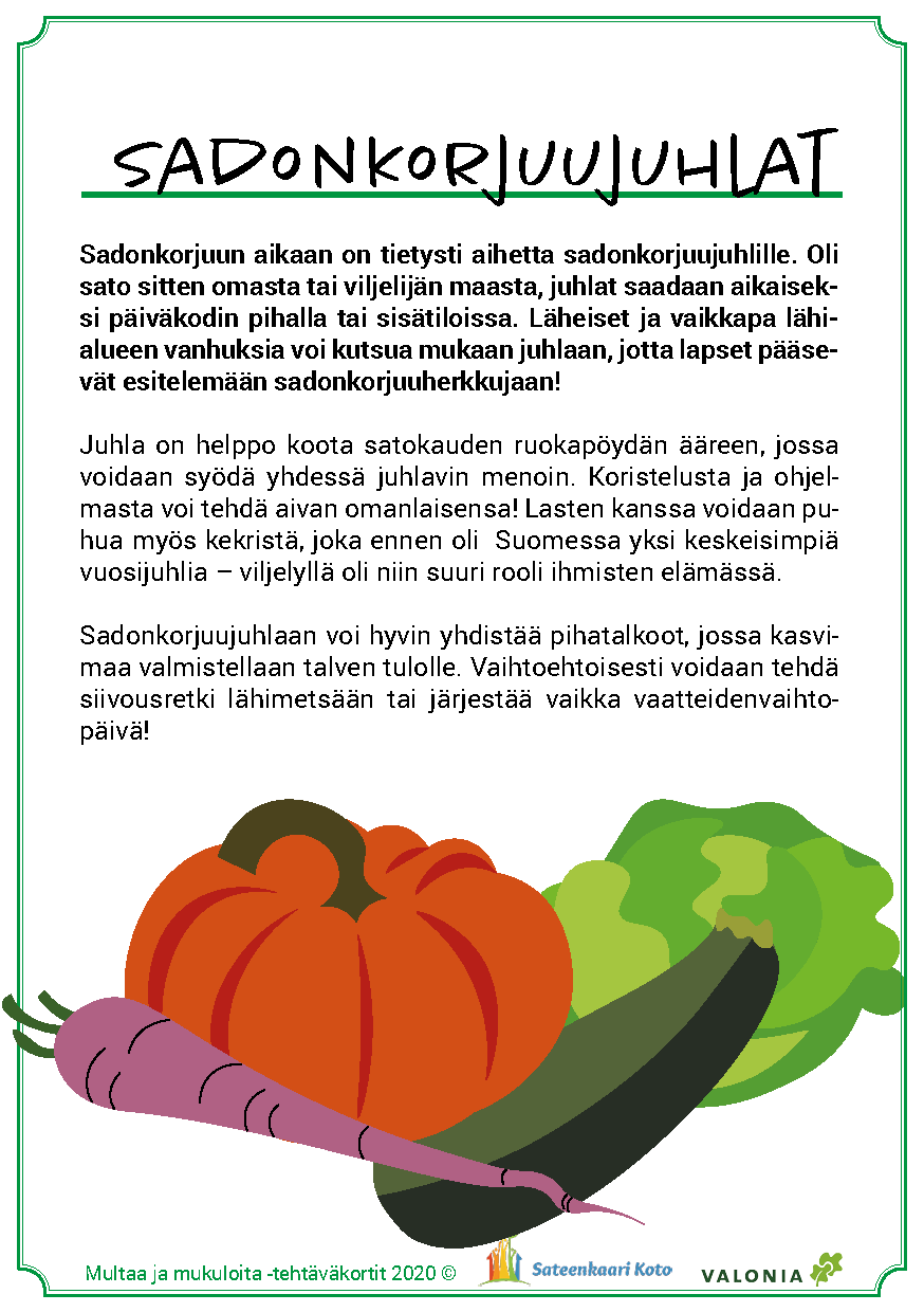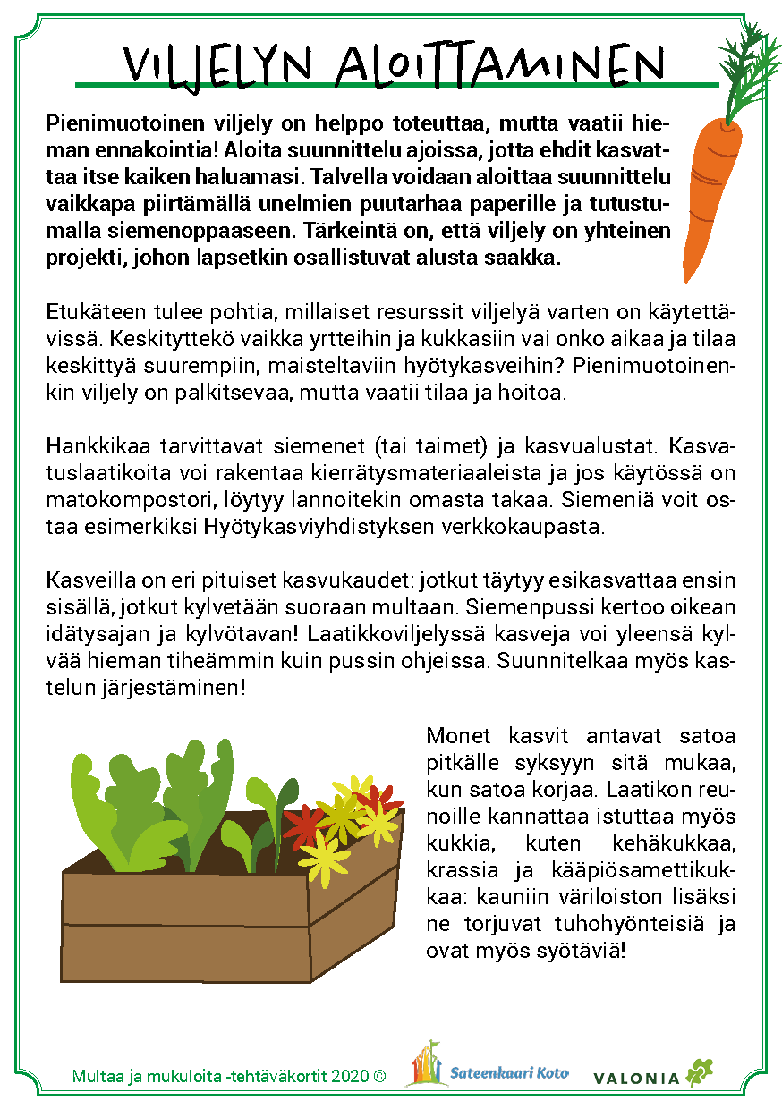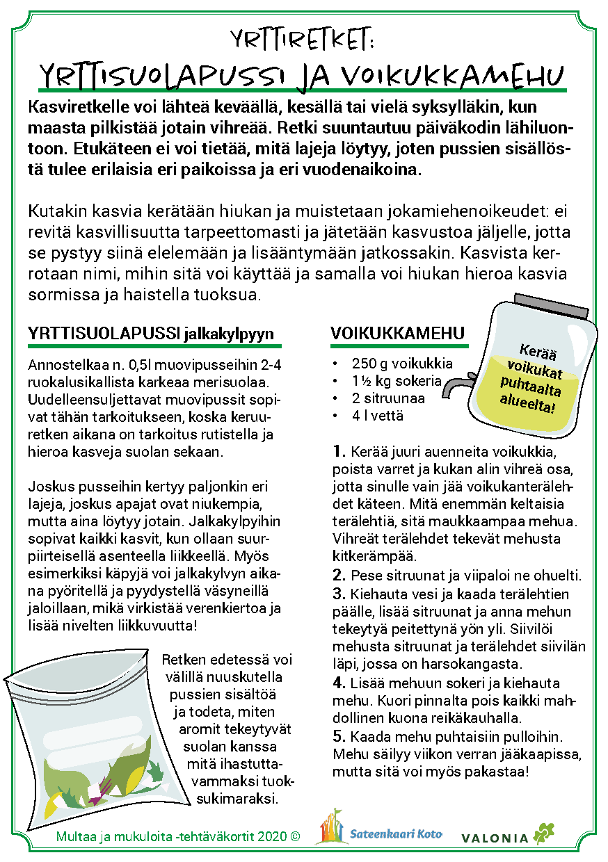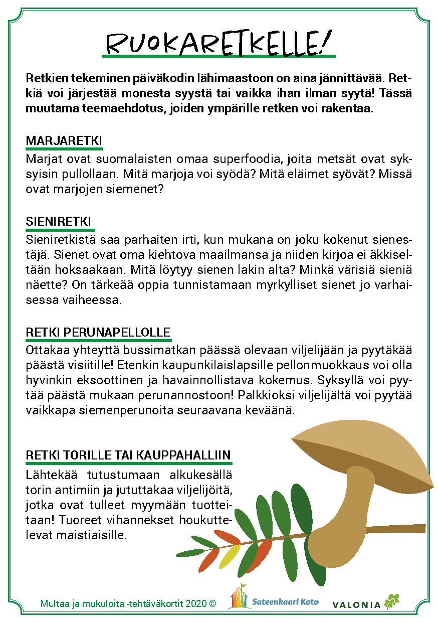 Materiaalin käyttö on joustavaa ja sen voi toteuttaa päiväkodin tarpeiden ja resurssien mukaan. Tärkeintä on löytää elämyksiä kasvien kasvattamisesta, maaperän ja hyönteisten tärkeästä roolista kasvun onnistumisessa sekä löytää uusia makuja. Toivotamme antoisaa retkeä ruoan oppimispoluille!