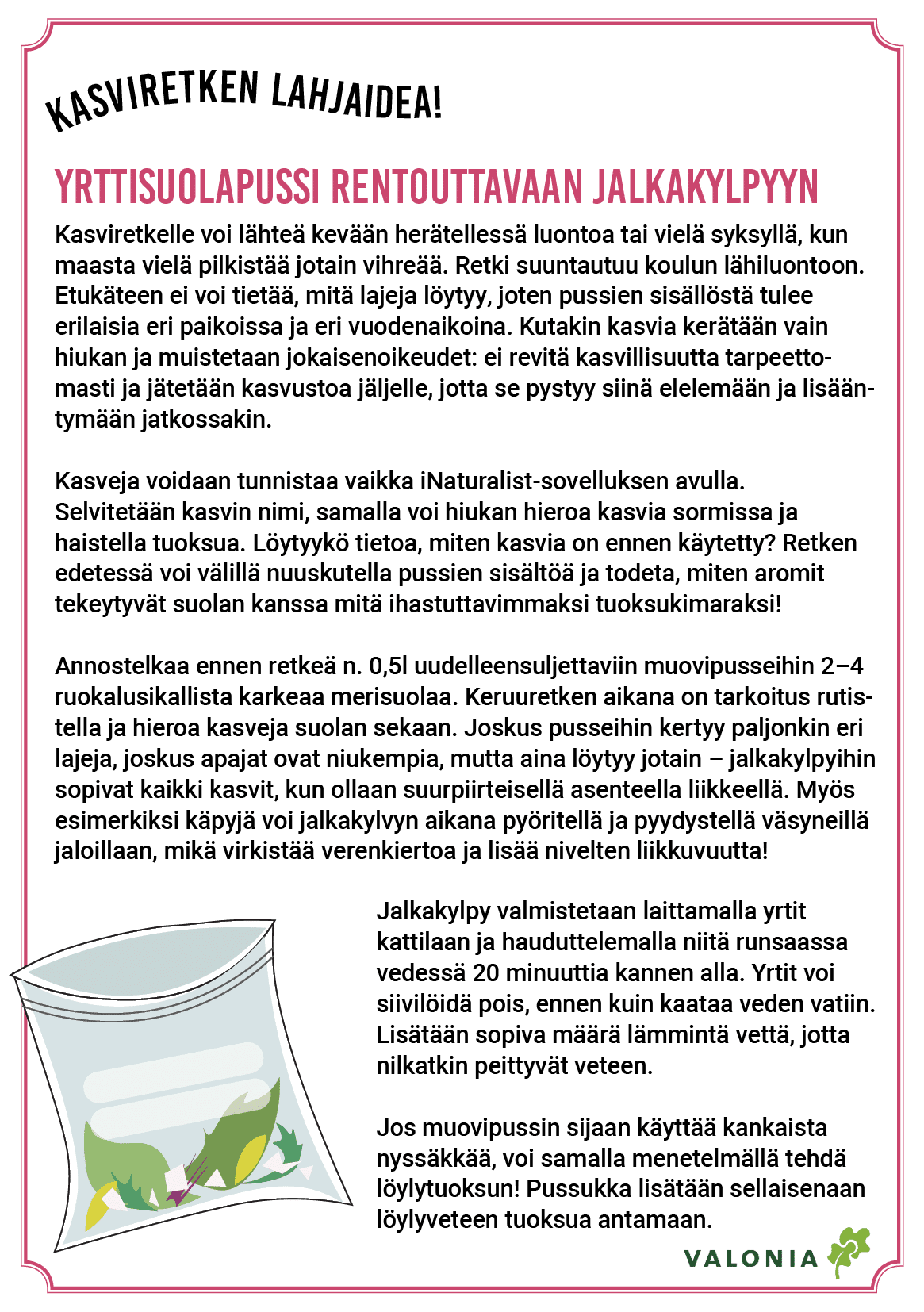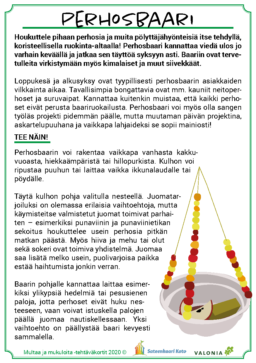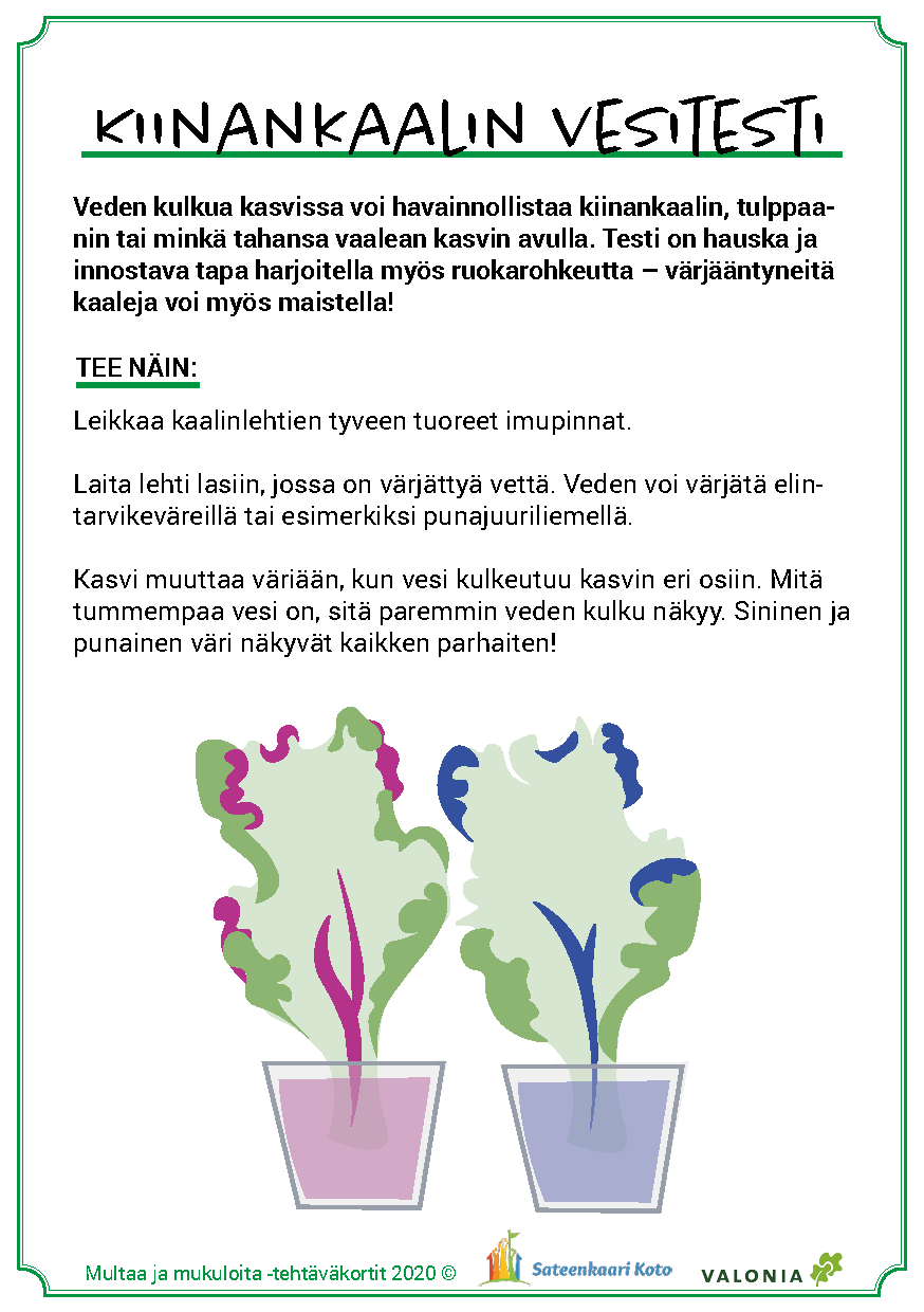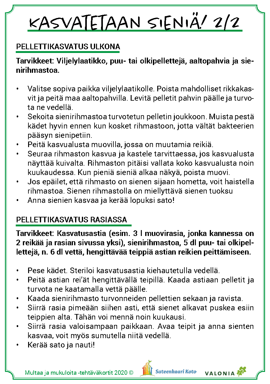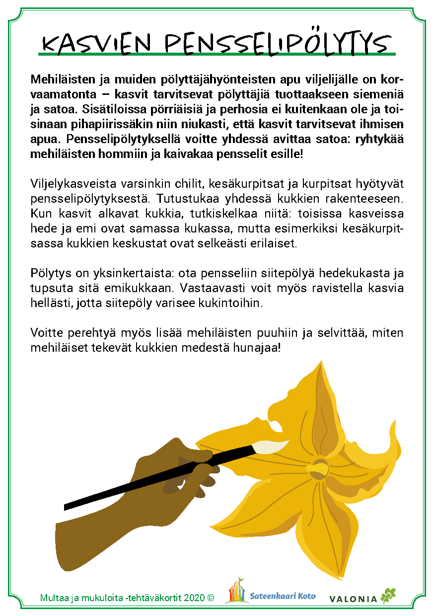 Materiaalin käyttö on joustavaa ja sen voi toteuttaa päiväkodin tarpeiden ja resurssien mukaan. Tärkeintä on löytää elämyksiä kasvien kasvattamisesta, maaperän ja hyönteisten tärkeästä roolista kasvun onnistumisessa sekä löytää uusia makuja. Toivotamme antoisaa retkeä ruoan oppimispoluille!