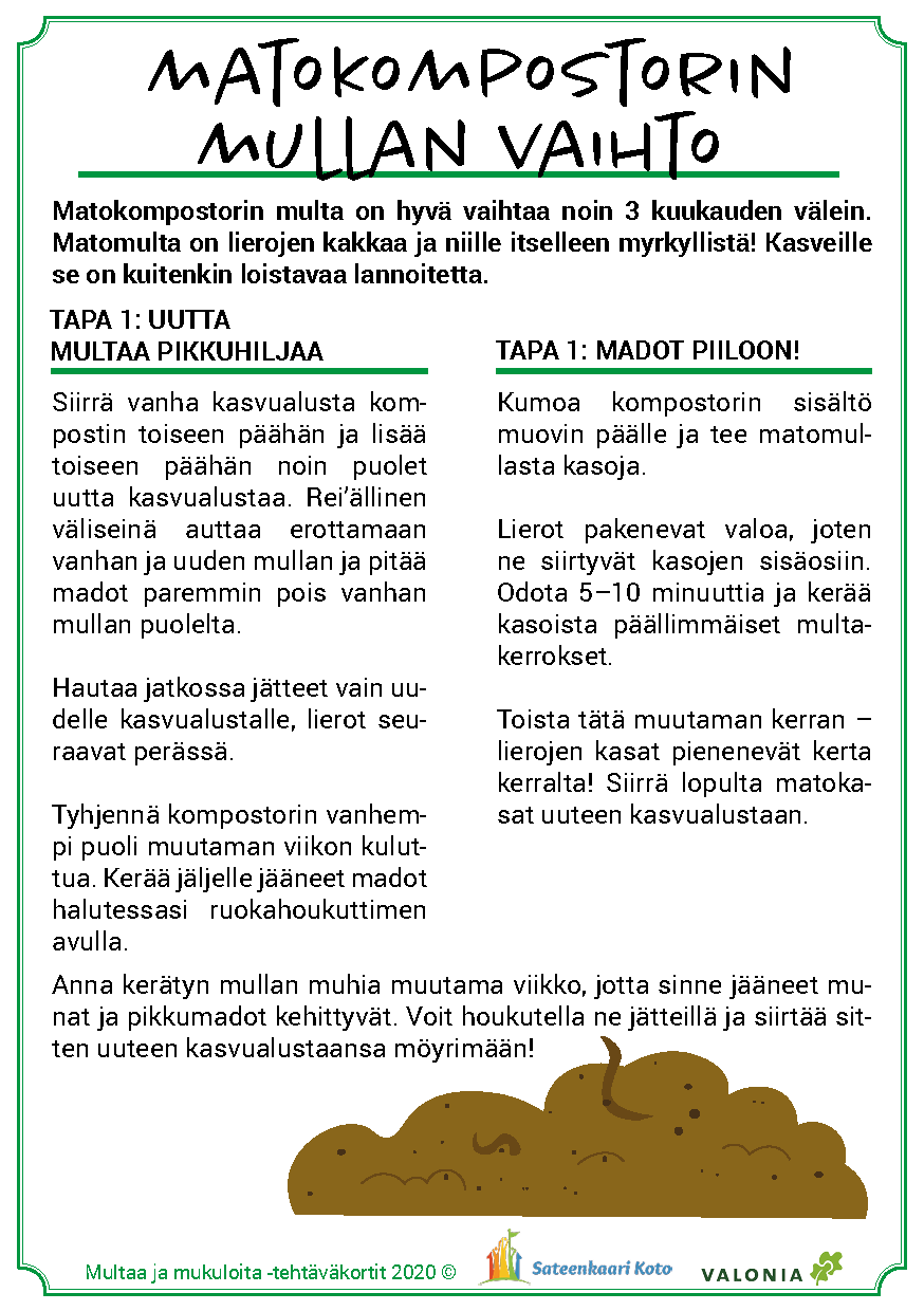 Multaa ja Mukuloita – kiertotalouden oppimispolut on toimintamalli ruoan kiertotaloudesta kasvattajien käyttöön. Malli tutustuttaa lapset leikin sekä lukuisten tehtävä- ja retkiesimerkkien avulla ruoan kasvattamisen vaiheisiin aina siemenestä ruoanvalmistukseen ja kompostoimiseen. Samalla tutustutaan arjen kiertotalouteen.