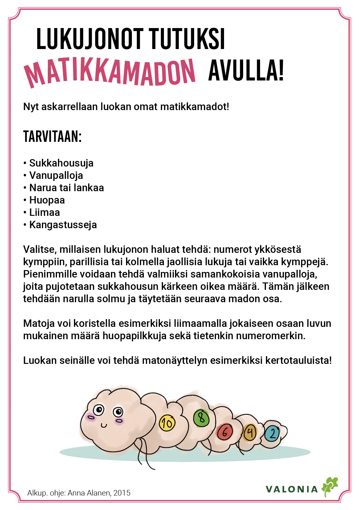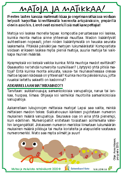 Materiaali kehitettiin päiväkotiympäristössä, mutta se soveltuu erinomaisesti myös alakoulujen 1–2 -luokkien oppilaille. Syksyllä 2024 materiaaliin päivitettiin muokkaamalla joitakin tehtäväkortteja erityisesti alakokoulaisia varten. Opettajalle on koottu selkeät ohjeet, vuosikello ja valmiita tehtäväkortteja mallin toteutukseen. Jokainen tekee mallista toki omannäköisensä!