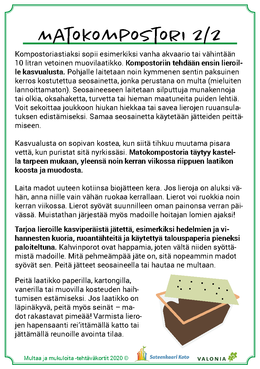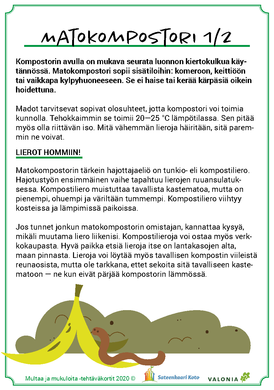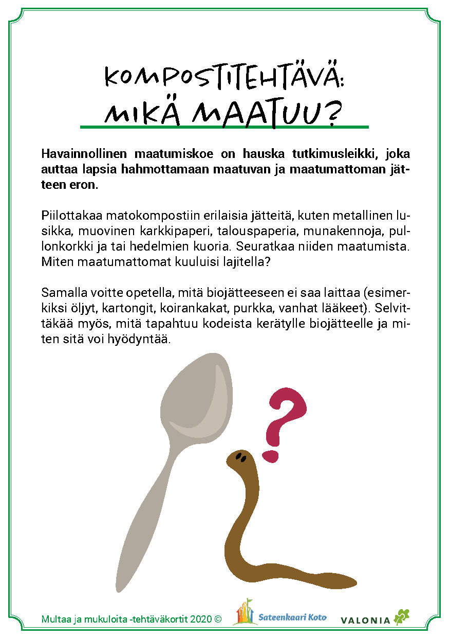 Matokompostorin perustamisen yhteydessä on tärkeä tutustua kompostoinnin hoitoon. Samalla voidaan tutustua siihen, millaiset roskat maatuvat ja mitä niille muille kuuluu tehdä. Tämän jälkeen näkökulmaa voi laajentaa esimerkiksi lähimetsään ja järjestää siellä yhteiset siivoustalkoot.