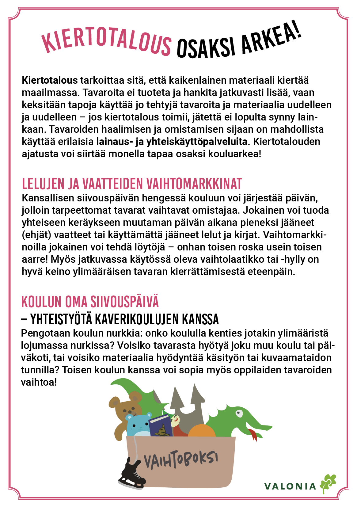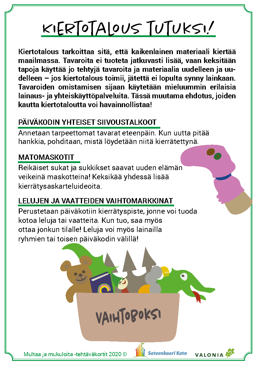 Kierrätyspolussa voi keskittyä biojäteasioihin, mutta tarjolla on tehtäviä muidenkin materiaalien kierrätykseen. Tutustutaan ajatukseen kiertotaloudesta, joka on myös paljon muutakin muin pelkkää kierrätystä: esimerkiksi lelulainauksen myötä voi herätellä ajatuksia tavaroiden yhteiskäytöstä sen sijaan, että jokainen omistaisi oman tavaransa. Mitä kaikkea voisikaan yhteiskäyttää? Leluja voi lainata myös päiväkotien välillä.
