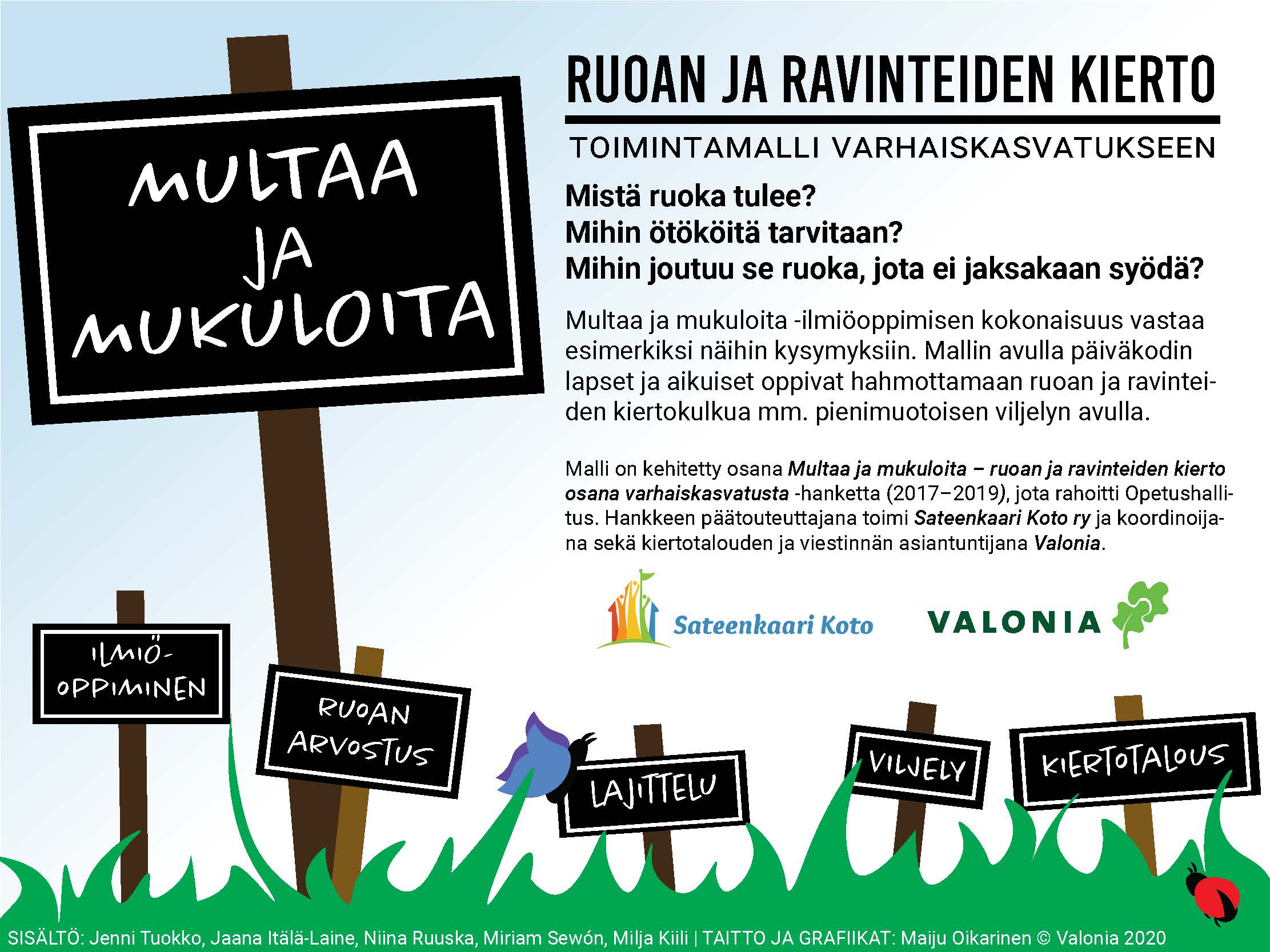 Materiaali on tuotettu Multaa ja Mukuloita -hankkeessa (hankeaika 1.9.2017-30.6.2019). Hankkeen päätoteuttajana oli Sateenkaari Koto ry ja hanketta pilotoitiin seitsemässä Sateenkaari Kodon päiväkodissa. Hankkeen asiantuntijoina toimivat Valonia, joka toimi myös hankkeen koordinaattorina ja materiaalipaketin kokoajana, Lounais-Suomen Jätehuolto Oy, Arkea Oy sekä Natur och Miljö.