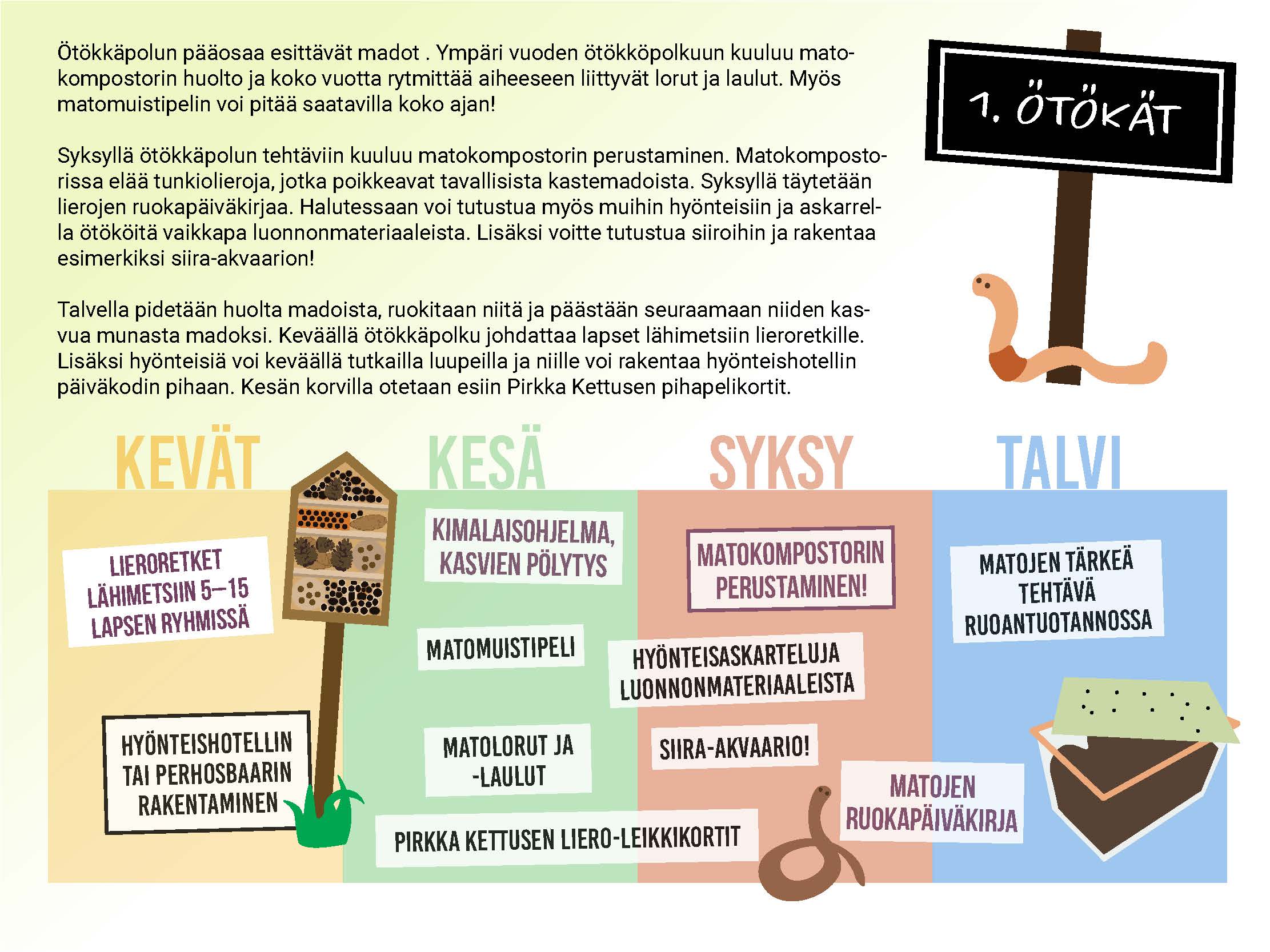 Ötökkäpolku opettaa lapsille, miten merkittävä rooli hyönteisillä on maailman ruoantuotannossa. Suosituimpia hyönteismaailman edustajia ovat ilman muuta olleet lierot. Matojen avulla lapset oppivat ravinteiden merkityksen ja sen, että maaperä pysyy terveenä ja elinkelpoisena ainoastaan matojen ja muiden maaperäeliöiden avulla. Liero Lipposen lierokortit sisältävät runsaasti leikkejä ja harjoitteita, joiden avulla voi tutustua matojen elämään. Hyönteisten houkuttelemiseksi voi myös rakentaa hyönteishotellin. Syksyllä voi tutustua toisiin maaperän hajottajiin, siiroihin, ja rakentaa niille siira-akvaarion.