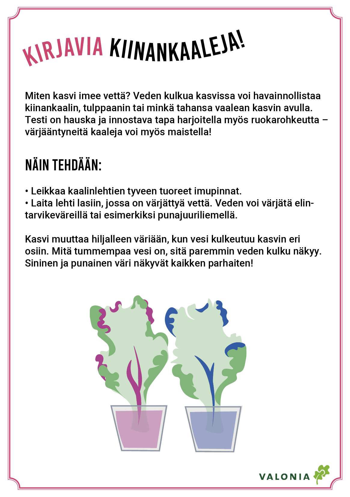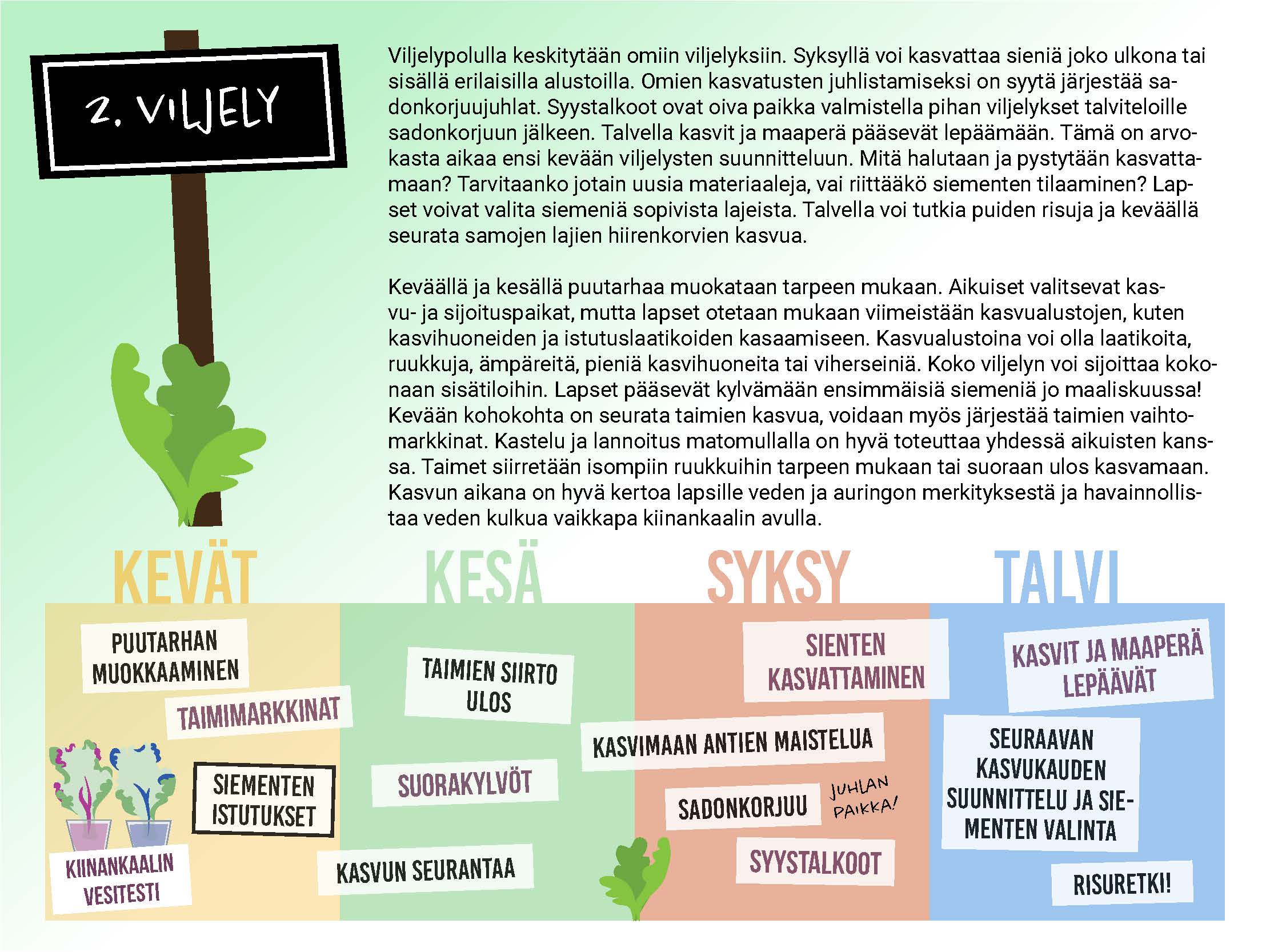 Kasvattaminen aloitetaan maaliskuussa sisätiloissa. Lapset voivat yhdessä aikuisten kanssa valita mieluisat siemenet kasvatettavaksi ja vaikkapa suunnitella paperille unelmien puutarhakuvia. Viljelytehtävät opettavat lapsille, mitä kaikkea kasvisten kasvuun tarvitaan. Esimerkiksi kiinankaalin vesitestikortin tehtävä havainnollistaa, miten vesi kulkeutuu kasvin kaikkiin osiin. Matokompostorin multa taas toimii erinomaisena lannoitteena. Kasvukausi huipentuu syksyn sadonkorjuujuhlaan, jolloin maistellaan kasvimaan antimia sekä leivotaan piirakoita ja muita herkkuja.