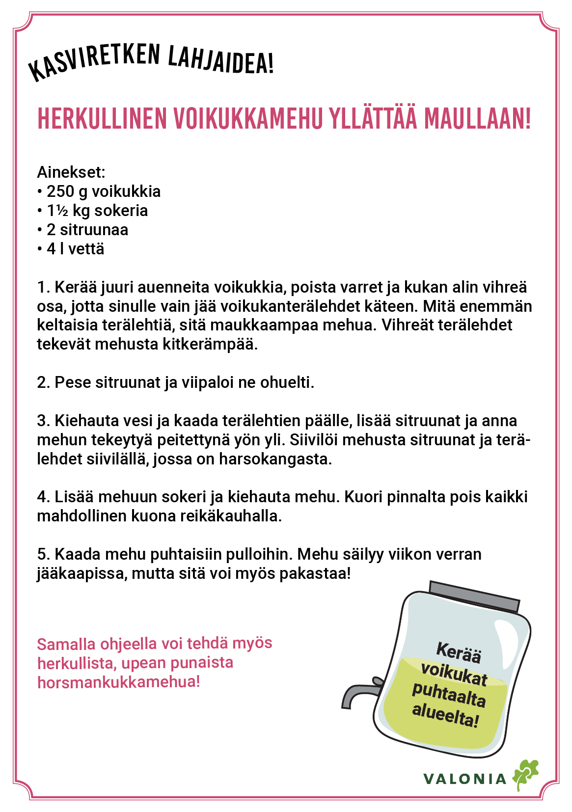Vuosikellon muotoon koottu materiaali koostuu neljästä eri polusta, joissa käsitellään ruoan kiertokulkua ja kiertotaloutta eri näkökulmista. Tarkoituksena on konkretisoida ruoan elinkaarta ja sen merkitystä jokapäiväisessä arjessamme.