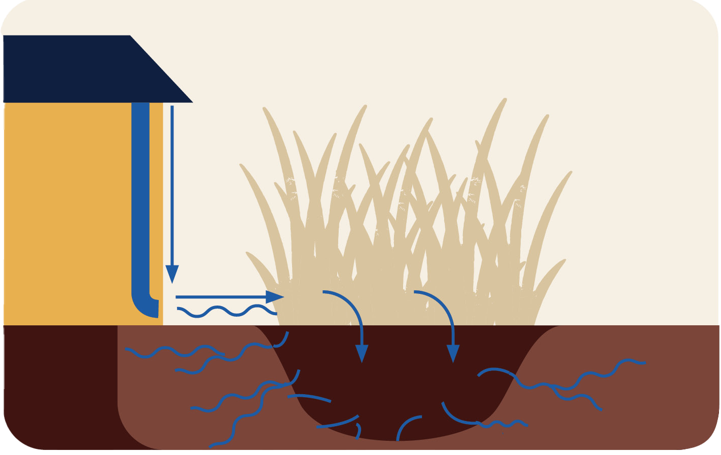 - Sadepuutarha sijoitetaan rakennusta alemmalle, melko tasaiselle alueelle tai veden valumareitille, jossa ei ole maanalaista infrastruktuuria.